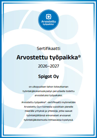 Spigot Oy on ulkopuolisen tahon toteuttaman työntekijäkokemuskyselyn perusteella todettu arvostetuksi työpaikaksi. Arvostettu työpaikka® -sertifikaatti myönnetään Arvostettu Oy:n toimesta vuosittain pienelle määrälle yrityksiä ja yhteisöjä, jotka saavat työntekijöiltänsä erinomaiset arvosanat työntekijäkokemusta mittaavassa kyselyssä